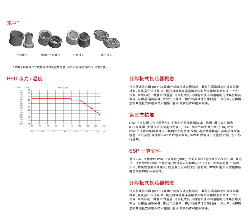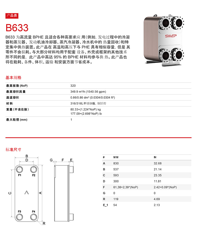 邮箱:dl_lijuan@126.comB633 为高流量 BPHE 且适合各种高要求应用(例如,发电过程中的冷凝器和蒸发器、发动机油冷却器、蒸汽冷凝器、冷水机中的热量回收)和特定集中供热装置。此产品在高温和高压下与 PHE 具有相似容量,但是其零件不会损耗。与大部分材料均用于配套设备、外壳或框架的其他技术所不同的是,此产品中高达 95% 的 BPHE 材料均参与换热。此产品也将在能耗、备件、体积、运输和安装方面节省成本。