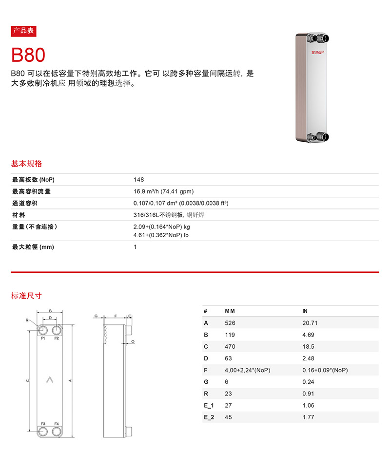 B80 为中型高容量型号。它是大多数低容量冷水机应用和高性能热泵的很好的选择。它满足各种容量范围的集中供热点,并且是压缩机和液压装置的成熟油冷却器。