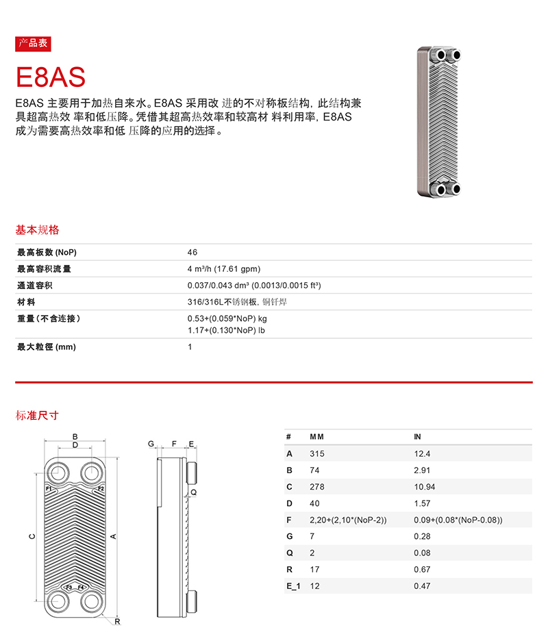 E8AS 主要用于加热自来水。E8AS 采用改进的不对称板结构,此结构兼具超高热效率和低压降。凭借其超高热效率和较高材料利用率,E8AS 成为需要高热效率和低压降的应用的选择。
